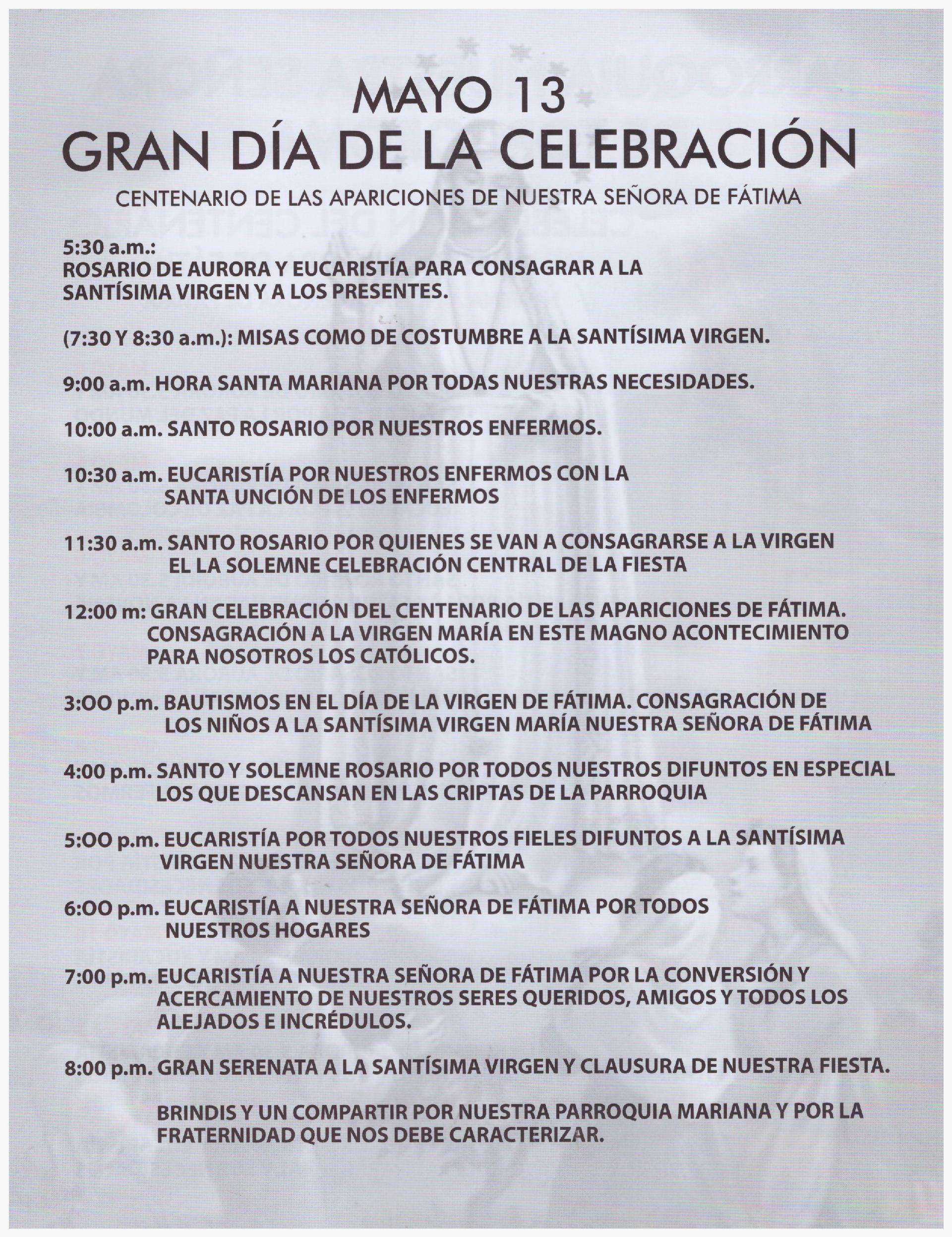 Celebración del centenario de Nuestra Señora de Fátima 1 de Mayo de 2017 ¡Celebremos en comunidad este gran acontecimientos! Conoce la programación especial que tenemos para ti. Like 0 Dislike 0 Otros artículosProgramación Semana Santa 202621 de Marzo de 2026Participa en la Semana Mayor, vive cada una de nuestras celebraciones y reflexiona sobre el misterio de la salvación. Ac... “Señor, dame de esa agua para que no vuelva a tener sed”8 de Marzo de 2026Reflexión para el III Domingo de Cuaresma
