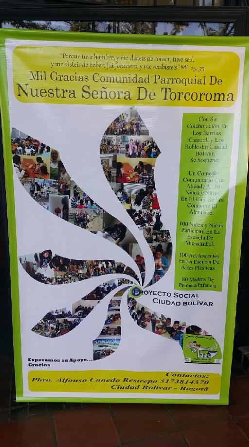 Lo ocurrido no será motivo para que los feligreses de Nuestra Señora de Torcoroma, en cabeza por su párroco, sigan apoyando las labores sociales que buscan favorecer a los hermanos necesitados en Ciudad Bolívar, El Codito y otros sectores de la ciudad de Bogotá. Gracias a ello se han visto beneficiados más de 100 niños en un comedor comunitario, una escuela de Microfútbol, de Artes Plásticas y 80 madres de primera infancia.