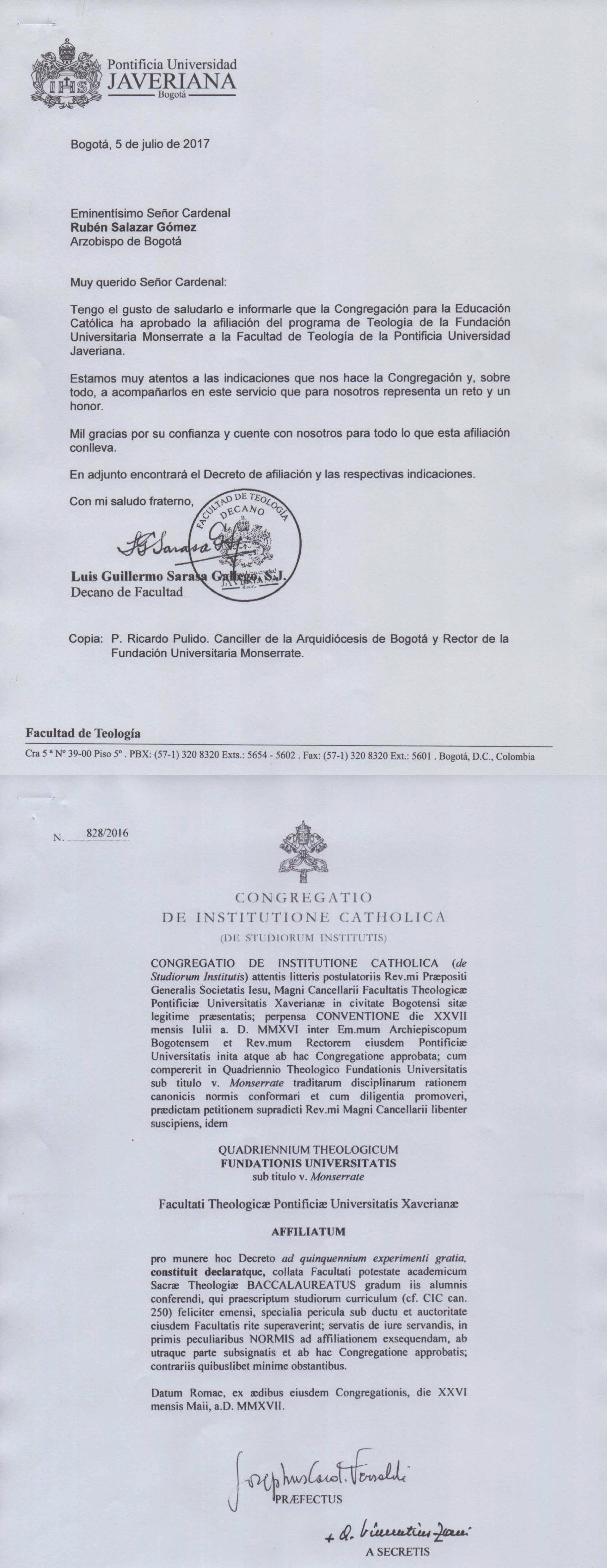 Aprobación de la afiliación del Programa de Teología de la UNIMONSERRATE a la Facultad de Teología de la Pontificia Universidad Javeriana