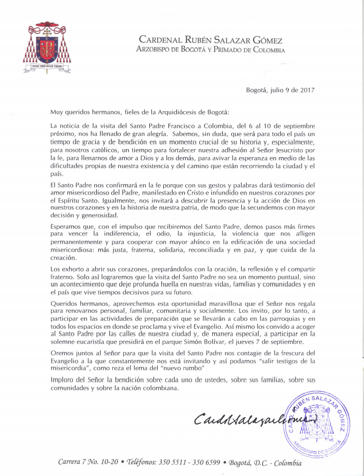 Carta del arzobispo de Bogotá Rubén Salazar Gómez, a todos los fieles de la arquidiócesis de Bogotá