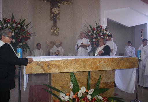 Luego el Obispo lo unge con el santo crisma (aceite) las cinco cruces grabadas en la piedra, que representan las cinco llagas de Nuestro Señor Jesucristo” e inciensa en repetidas ocasiones quedando este altar bendito allí se introducen las reliquias.
