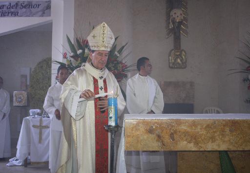 A ambos lados dos candelabros con cirios encendidos.