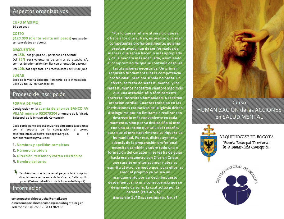 Centro de información Yo quiero Noticias Boletines Eventos Artículos Canonización Mensajes del Señor Cardenal Cartas pastorales Homilías Mensajes La voz del pastor Documentos del Vaticano NoticiasCurso Humanización de las acciones en salud mental30 de Junio de 2016Curso dirigido a: Animadores de evangelización, voluntarios y profesionales que trabajen o quieran trabajar directamente con personas en riesgo psicosocial y espiritual… Like 0 Dislike 0 Noticias relacionadas ¡Inscríbete ahora! Informamos ‼️🚨Denunciemos