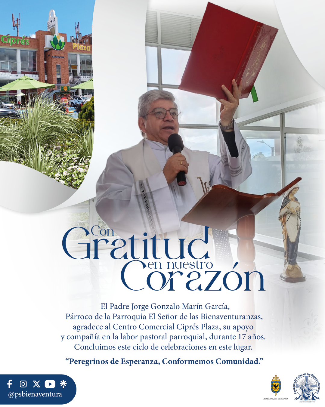 Con profundo agradecimiento informamos a toda nuestra comunidad, que la última celebración de la Santa Misa dominical en el Centro Comercial Ciprés Plaza, fue el pasado domingo 25 de mayo de 2025.