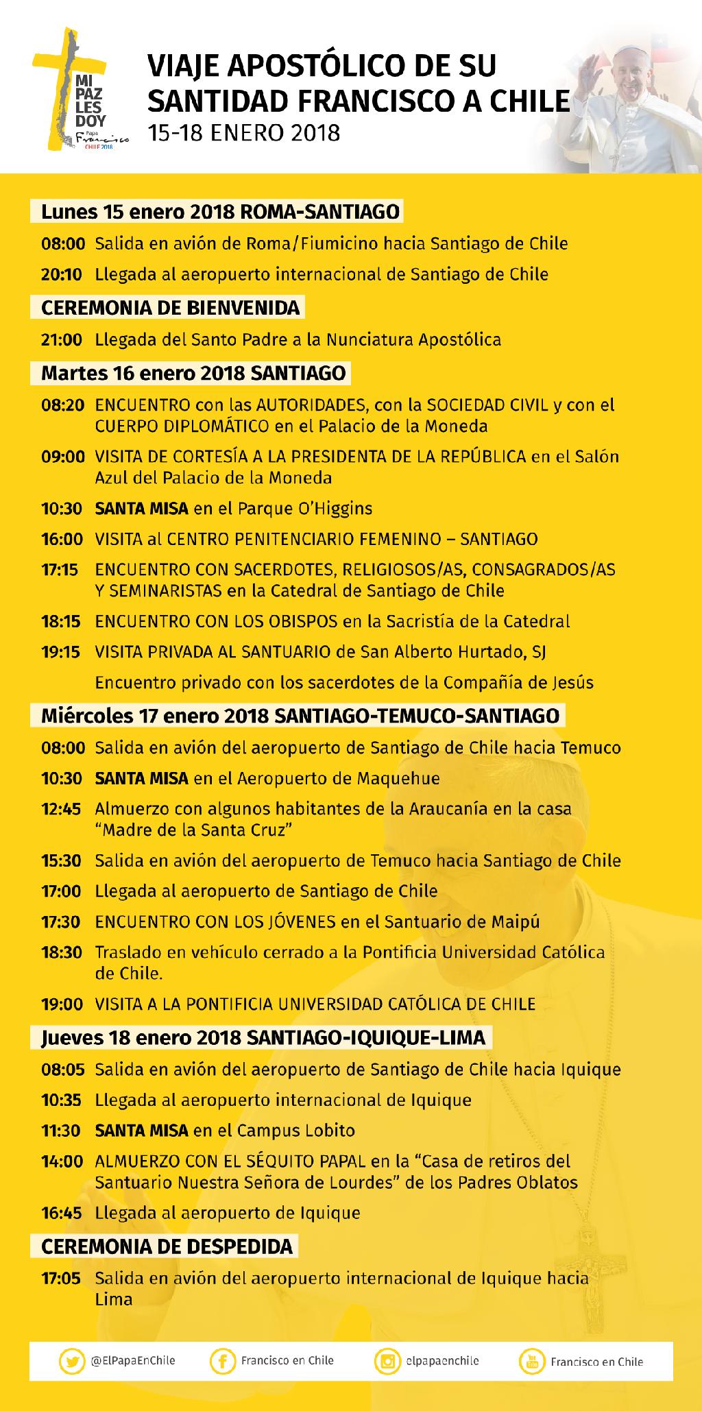 En torno a las 21 horas llegará a la nunciatura apostólica de Santiago de Chile, donde estará hasta el jueves, 18 de enero.