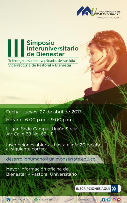 Centro de información Yo quiero Noticias Boletines Eventos Artículos Canonización Mensajes del Cardenal Cartas pastorales Homilías Mensajes La voz del pastor Documentos del Vaticano NoticiasIII Simposio Interuniversitario de Bienestar "Interrogantes interdisciplinarias de suicidio"18 de Abril de 2017Inscripciones abiertas hasta el 20 de abril, mayor información oficina de Bienestar y Pastoral Universitario Like 0 Dislike 0 Noticias relacionadas Alerta a la comunidad: circulación de videos falsos del cardenal Luis José Rueda Aparicio ✅ Dona en tu parroquia Mensaje de Mons. Edwin Vanegas Cuervo, obispo auxiliar de Bogotá