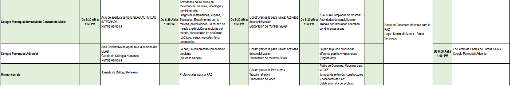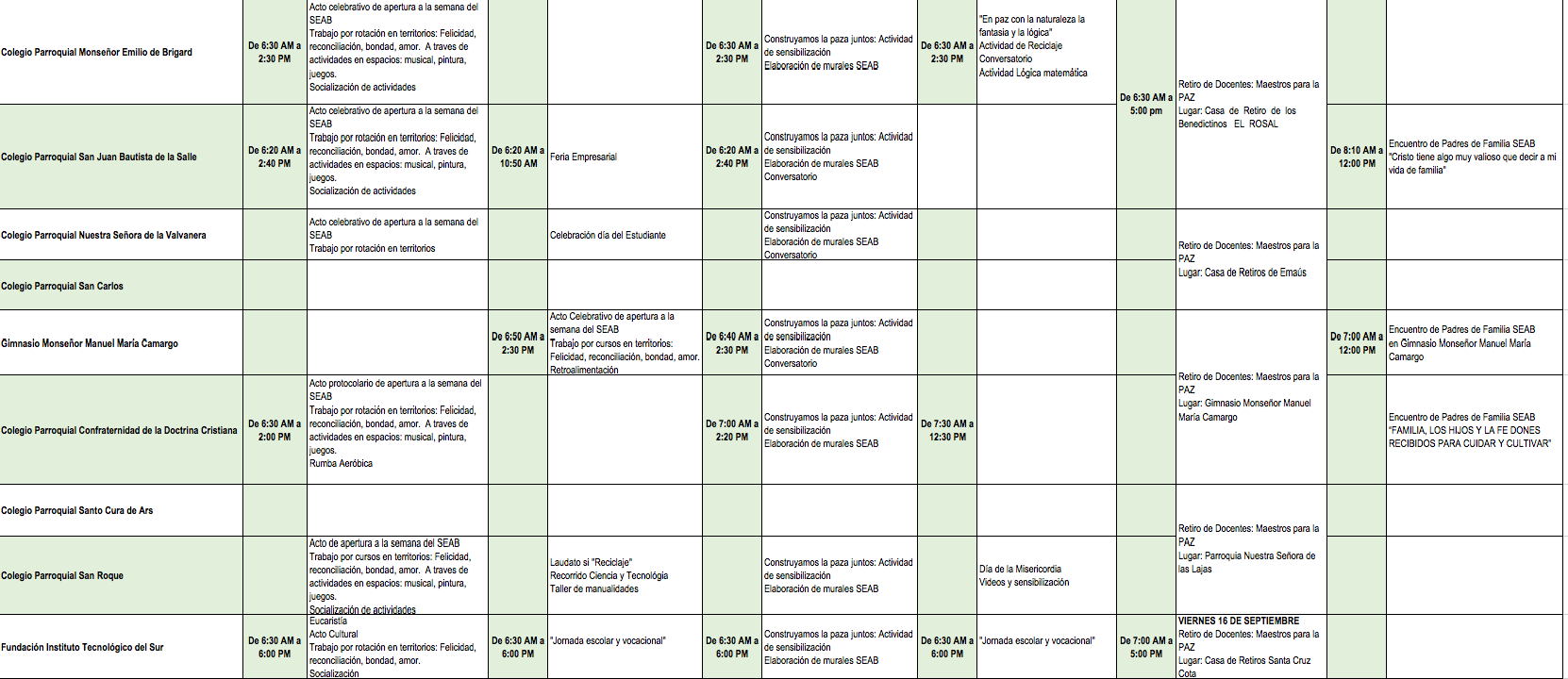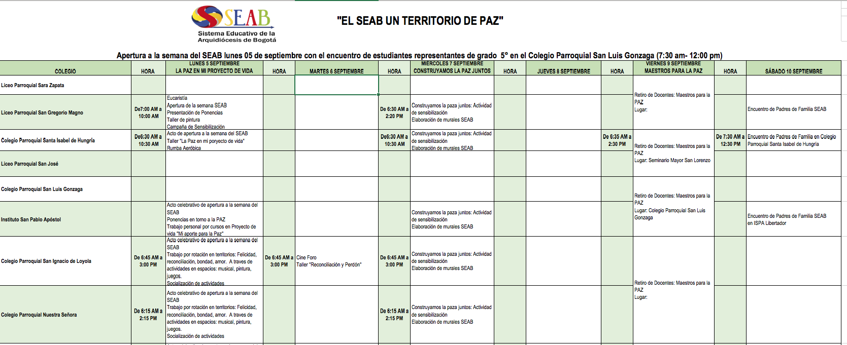Centro de información Yo quiero Noticias Boletines Eventos Artículos Canonización Mensajes del Cardenal Cartas pastorales Homilías Mensajes La voz del pastor Documentos del Vaticano NoticiasProgramaciónEl SEAB un territorio de Paz5 de Septiembre de 2016Descargue la programación a continuación:Programación semana del SEABDescargar Like 0 Dislike 0 Noticias relacionadas Alerta a la comunidad: circulación de videos falsos del cardenal Luis José Rueda Aparicio ✅ Dona en tu parroquia Mensaje de Mons. Edwin Vanegas Cuervo, obispo auxiliar de Bogotá